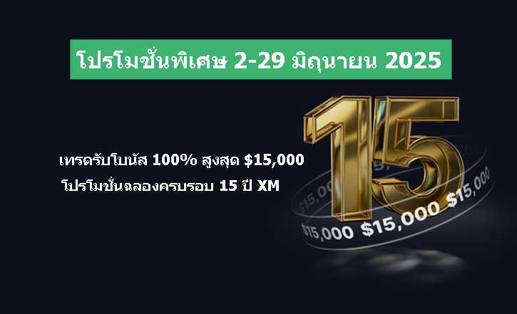 XM ฉลองครบรอบ 15 ปี ด้วยเงินฝากที่ยิ่งใหญ่ ตั้งแต่วันที่ 2 ถึง 29 มิถุนายน 2025 เป็นเวลา 4 สัปดาห์ ในโปรโมชั่นนี้ ผู้เข้าร่วมสามารถรับโบนัสเงินฝาก 100% สูงสุด $3,750 รายสัปดาห์ และหากเข้าร่วมครบทั้ง 4 สัปดาห์ จะได้รับโบนัสรวมสูงสุด $15,000 แต่ละสัปดาห์จะดำเนินการเป็นโปรโมชั่นแยกต่างหาก ผู้เข้าร่วมสามารถเลือกเข้าร่วมได้ โดยคลิกที่ลง ทะเบียน โปรโมชั่นพิเศษฉลองครบรอบ 15 ปี